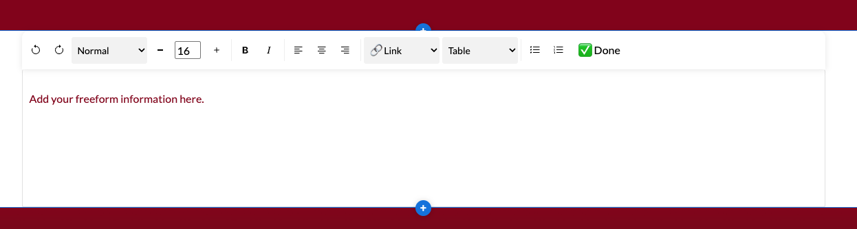 The Freeform Designer Section allows you to add flexible, custom content to your Amplify page using a rich text editor. This section is ideal for adding formatted text, links, images, tables, and other custom content that doesn’t fit into a structured layout.