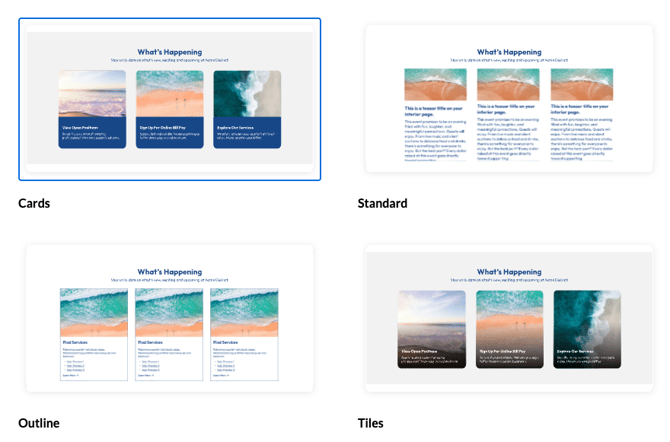 Displays image-forward tiles with text overlay. This style is great for visual storytelling or featured content.